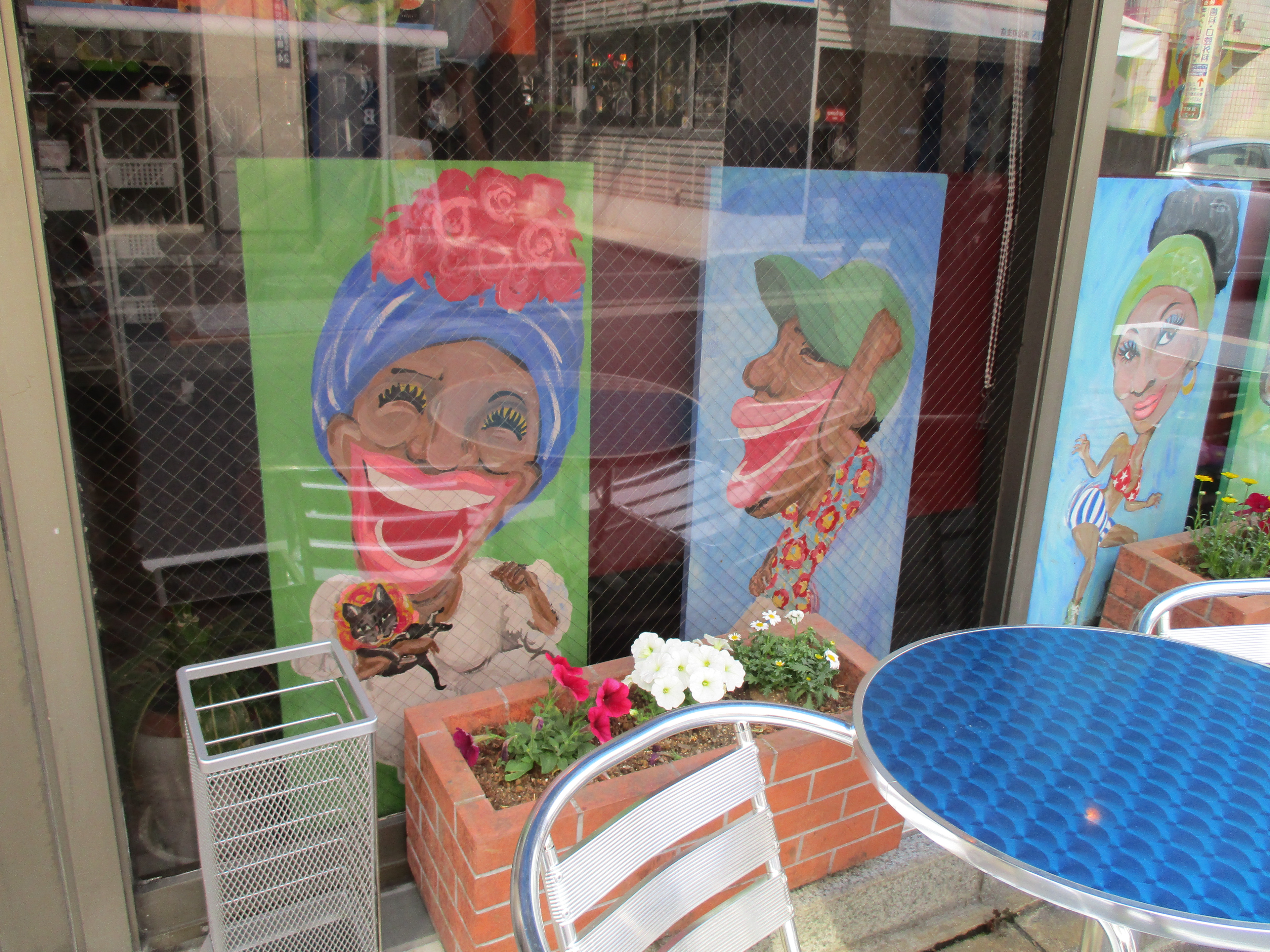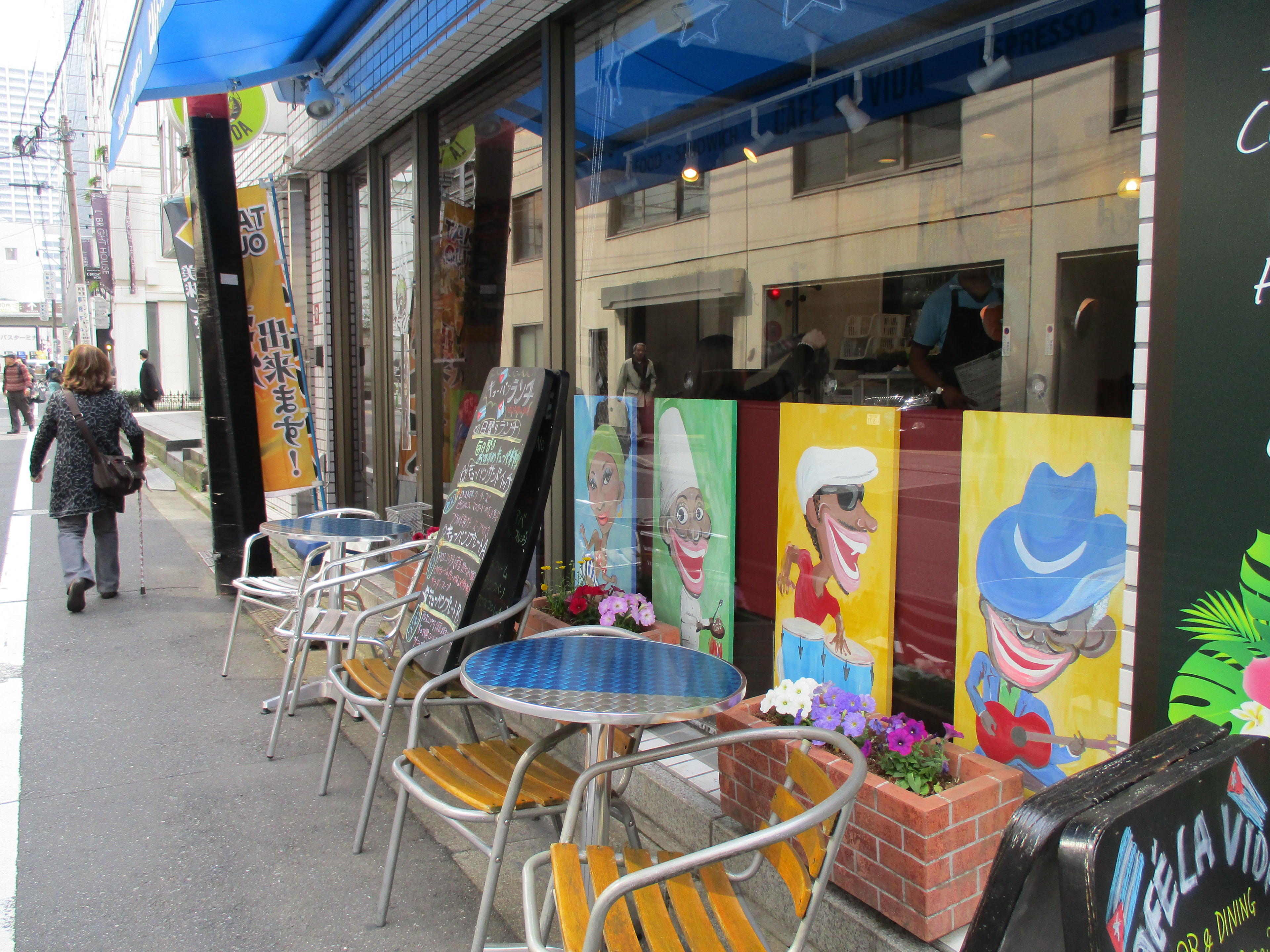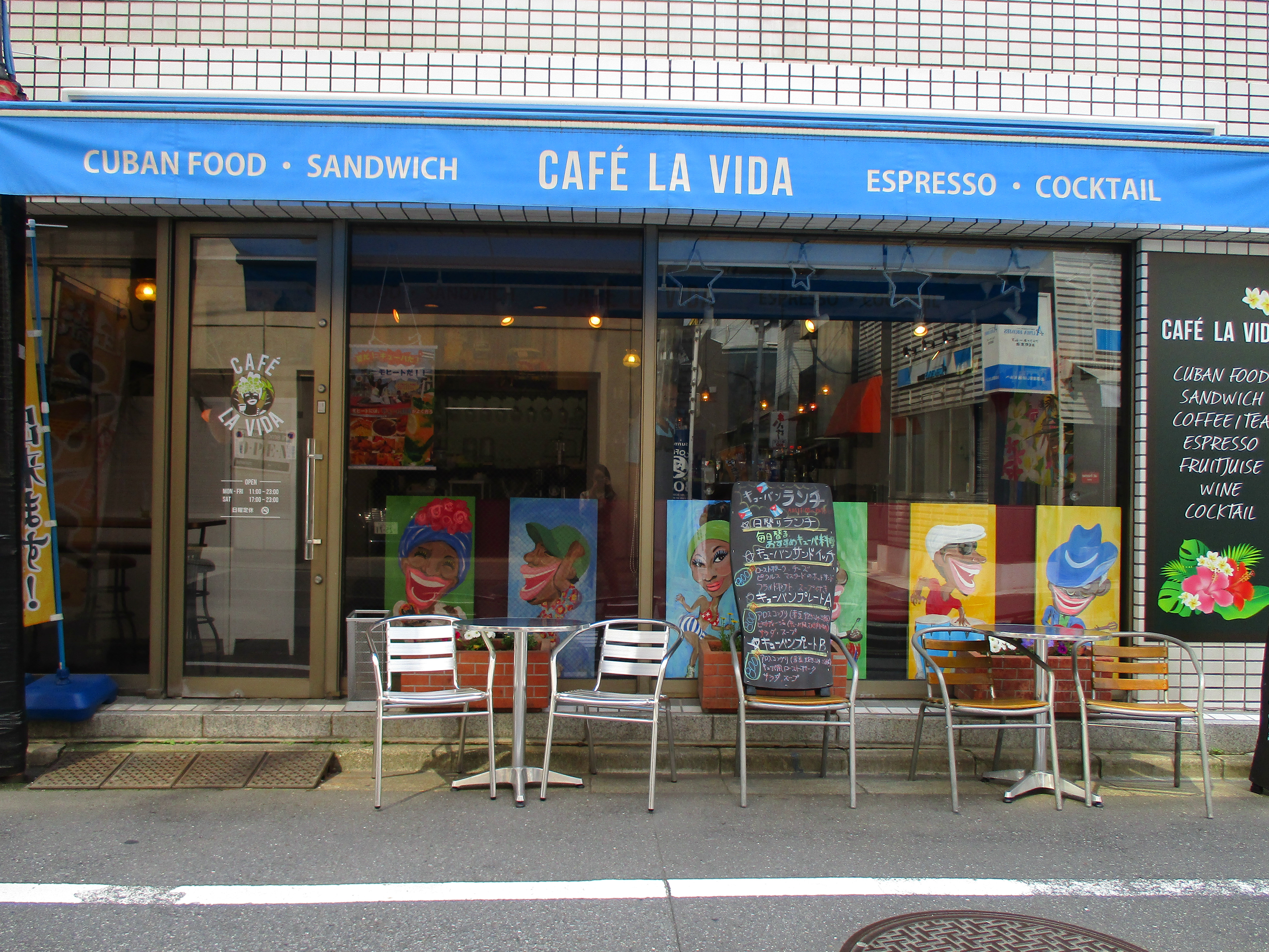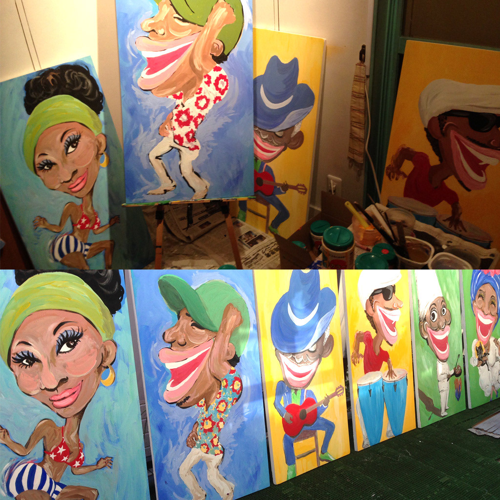 Created cafe facing display design for Cuban cafe"Cafe la vida". 6 funny Cuban people are dancing or playing music on the street.